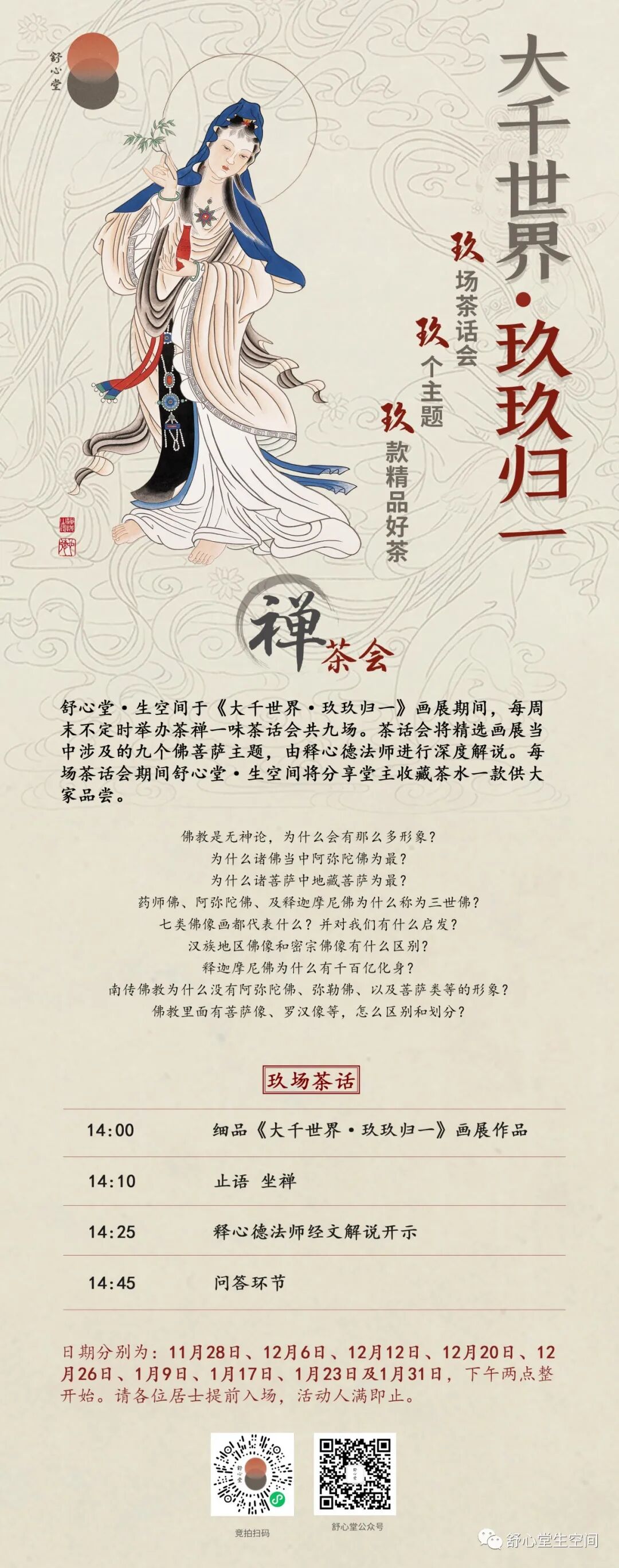 本次展览期间舒心堂将举办九场茶话会活动,在展期内的九个周末下午都有“一场茶话会,一个主题,九本画册,一款精品茶选”,欢迎信众们前来与释心德法师一起共鸣佛音,共会禅意。
